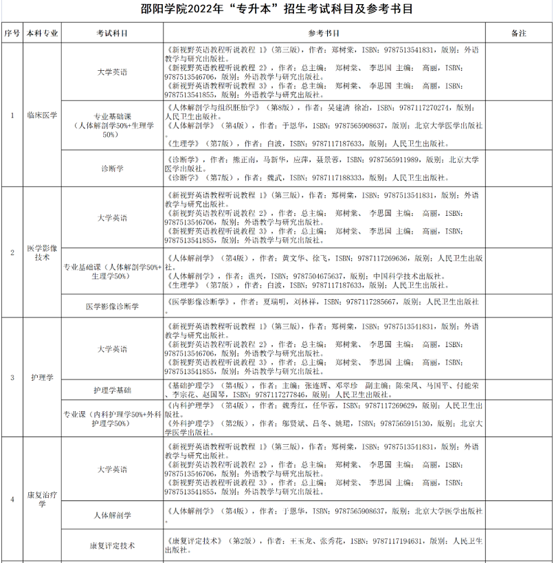• 邵阳学院2022年“专升本”招生考试科目及参考书目